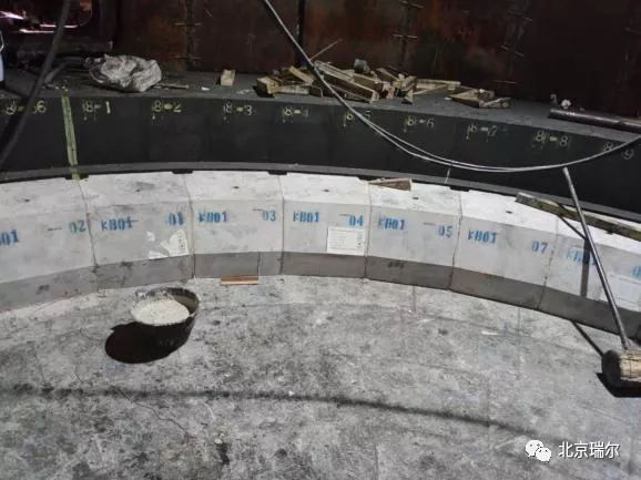 爐缸設計10層環形炭磚、4層陶瓷杯壁磚,陶瓷杯壁磚總高度3188mm.陶瓷杯壁磚采用燕尾槽結構,沒有冷熱面直接貫穿磚縫,陶瓷杯壁與環形炭磚之間采用剛玉澆注料整體澆注,通過燕尾槽將澆注體和陶瓷杯壁形成穩定的整體,有效地增強了陶瓷杯壁的結構穩定性,并有效地防止堿金屬、鋅等金屬對炭磚的侵蝕。